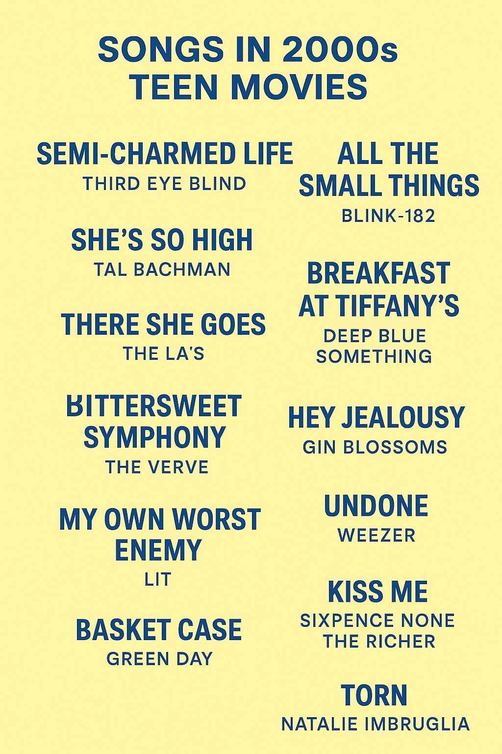 If you grew up watching teen comedies in the late 1990s and early 2000s, chances are you can hum—or even belt out—dozens of songs that seemed to be on every movie soundtrack. Those films, from Clueless to 10 Things I Hate About You to She’s All That, relied heavily on contemporary pop-rock hits to capture the spirit of adolescence: the awkward crushes, the first heartbreaks, the wild parties, and the over-the-top high school melodrama. Among hundreds of songs that defined that era, a dozen repeatedly appeared across teen movies, becoming synonymous with the high school experience itself.